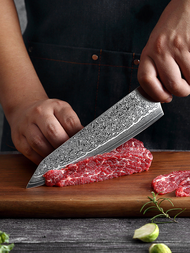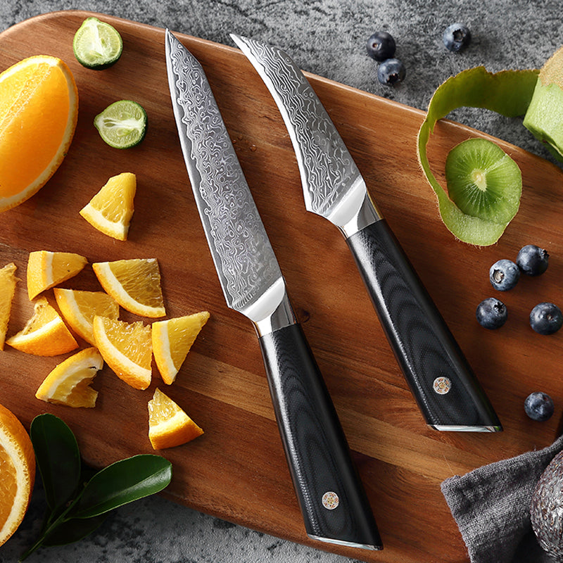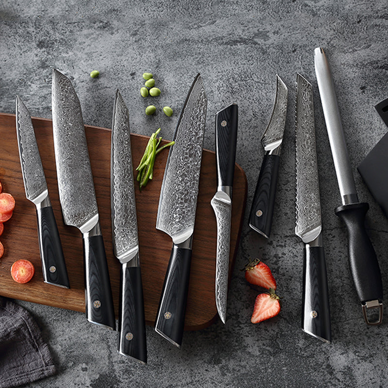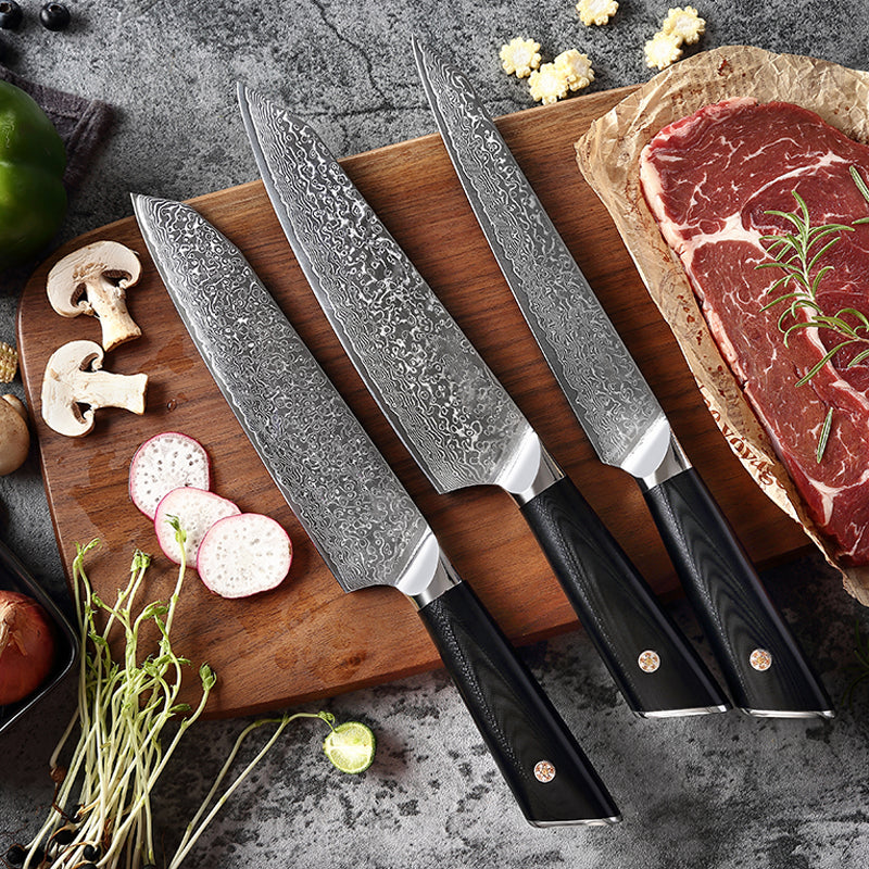 The hardness of cutlery made of Damascus steel can amount to 67± VG10 Steel core.What's more, the pattern on each knife is different. The uniqueness of each item makes it an artwork suitable for collection or household usage by young people.